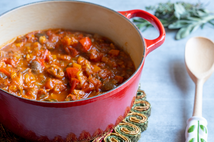 | 7. Haal de deksel van de pan en laat nog 30-45 minuten inkoken. Zet het vuur uit en roer als laatste de balsamico azijn erdoor. |