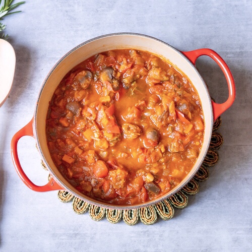 | 4. Snijd de paprika in blokjes. Snijd de courgette en aubergine in partjes. En snijd de champignons in plakjes. Voeg toe aan de pan en roer door. |