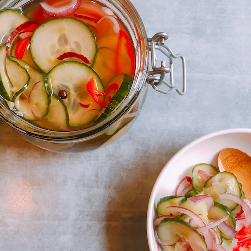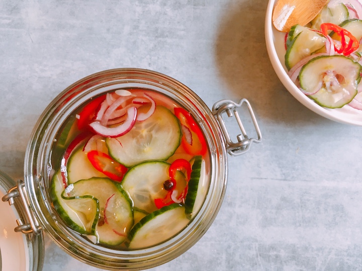 Bij een pittig gerecht is wat zoetzuur altijd lekker. Deze zoetzuur maak ik van komkommer en rode ui. Een pepertje voegt toch nog stiekem wat pit toe. Zoetzuur is lekker bij Aziatische en Surinaamse gerechten. Ik maak hem vaak bij broodjes bakkeljauw.