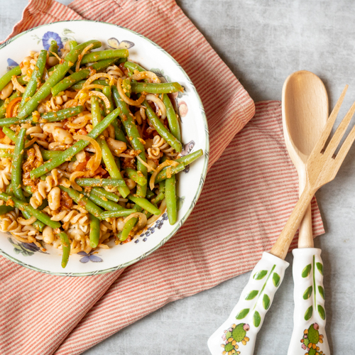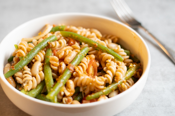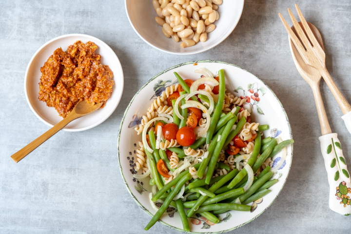 Pastasalade is denk ik mijn favoriete lunchsalade. Je hebt er duizenden soorten van en ik wil ze allemaal. Er staan dan ook al een aantal op de website. Pastasalade met tahin, met vegan pesto, met krokante tofu en nu met tomatentapenade. Deze is zoet van de zongedroogde tomaten, wat goed samengaat met de boontjes.