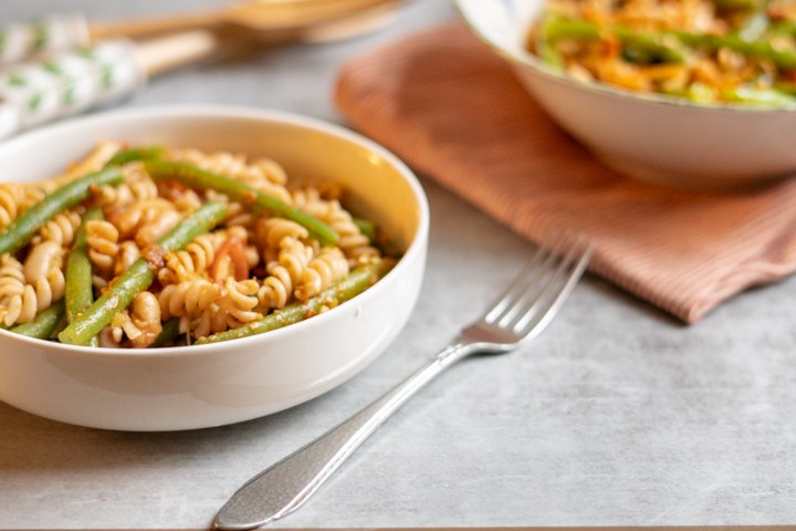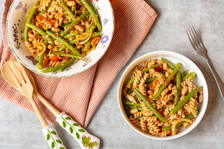| 3. Snij de ui in dunne halve ringen. Snijd de tomaatjes in vieren. Doe in een kom met de pasta en sperziebonen. |