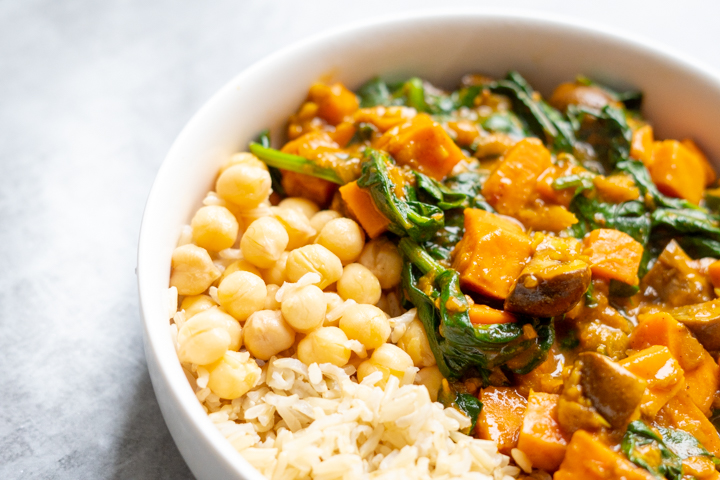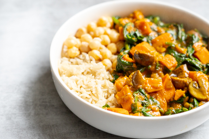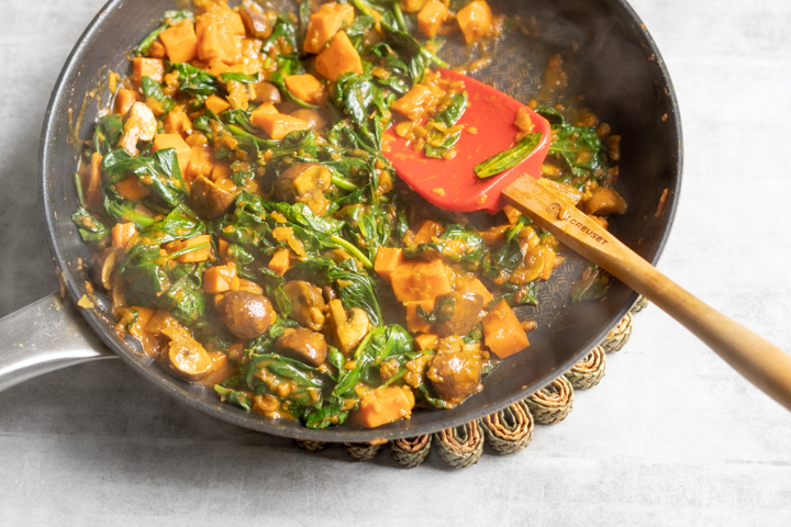 Dan natuurlijk de groenten. Dit keer zoete aardappel, champignon en spinazie. Lekker veel vitamines en door de aardappel ook stevig. Bij de curry kun je serveren wat je lekker vindt. Rijst, kikkererwten of naanbrood. Alles is er lekker bij.