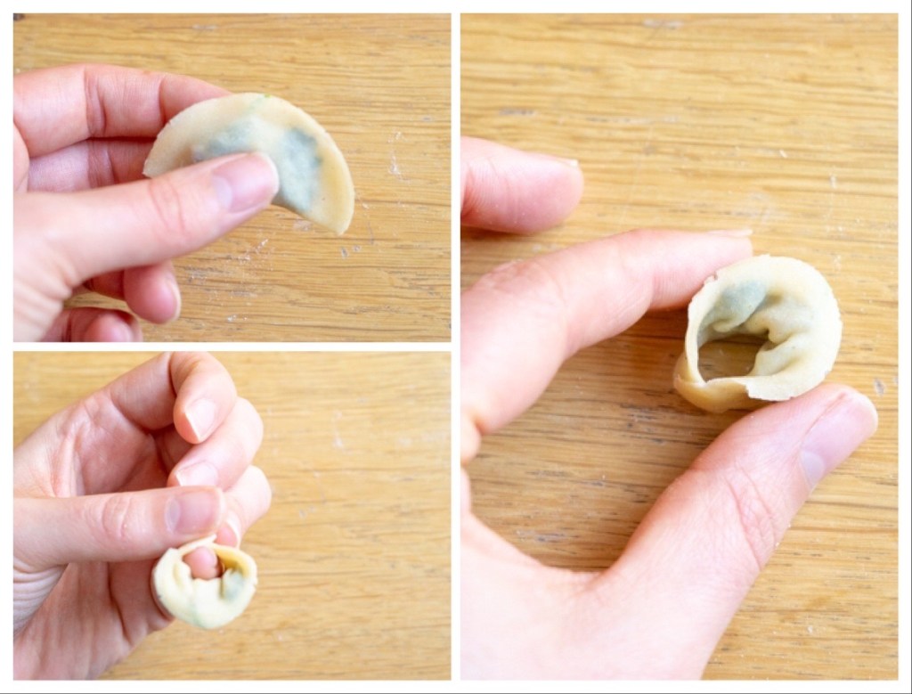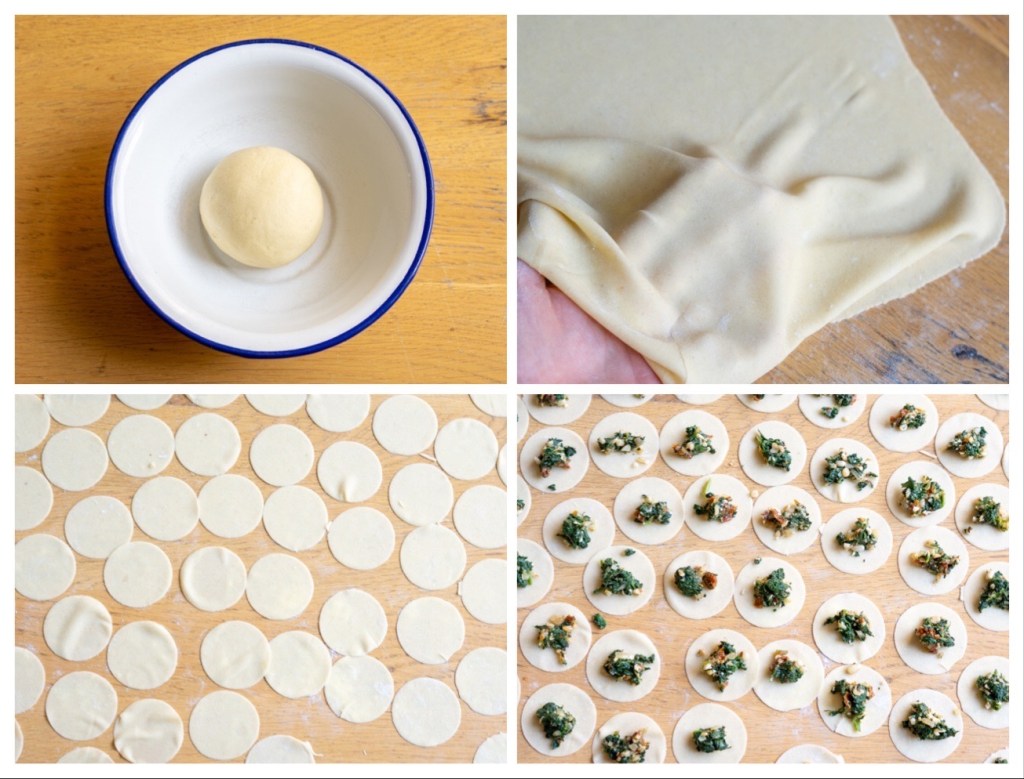 | 6. Ga verder met de pasta. Rol het deeg heel erg dun uit. Je moet de contouren van je hand kunnen zien als je deze eronder houdt. Steek er cirkels uit van 5 cm. Leg op iedere cirkel een klein hoopje vulling. Maak de rand van een cirkeltje nat. Vouw de cirkel dubbel en druk de rand goed aan. Vouw de punten naar elkaar toe. Maak de punten eventueel wat vochtig om ze goed te laten plakken. Herhaal met alle pasta. |