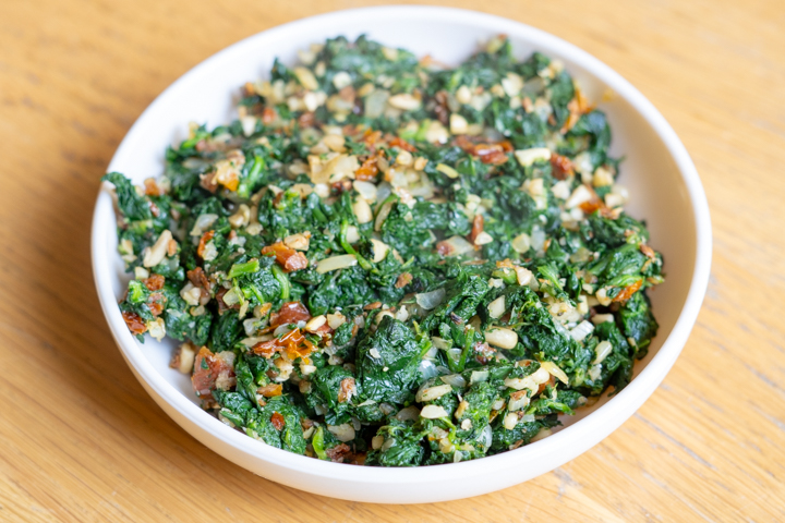 De vulling maak ik van wilde spinazie. Ik vind wilde spinazie erg lekker en veel smaak hebben. Haal hierbij de dikke takjes wel even weg. De rest kun je gewoon koken. Mocht je wilde spinazie niet kunnen vinden, dan kun je prima gewone spinazie gebruiken. Dan kun je het voorkoken overslaan. Bij de spinazievulling gaat vaak ricotta. Ik had een amandelricotta kunnen maken of iets dergelijks, maar vind het dubbelop met de romige saus. Ik kies voor smaakvolle zongedroogde tomaatjes en pijnboompitten.