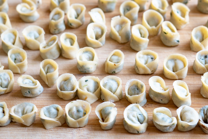 De pasta is vegan, geen eitjes. Ik gebruik de helft bloem, de andere helft fijne griesmeel. De griesmeel geeft de pasta zijn bite. Normaal zorgt eigeel voor wat vet in de pasta, ik vervang dit door extra vierge olijfolie. Verder alleen nog wat zout en water en je hebt pasta. Van deze pasta kun je allerlei soorten pasta maken, maar vandaag dus tortellini. Als we toch bezig zijn..