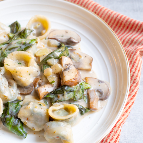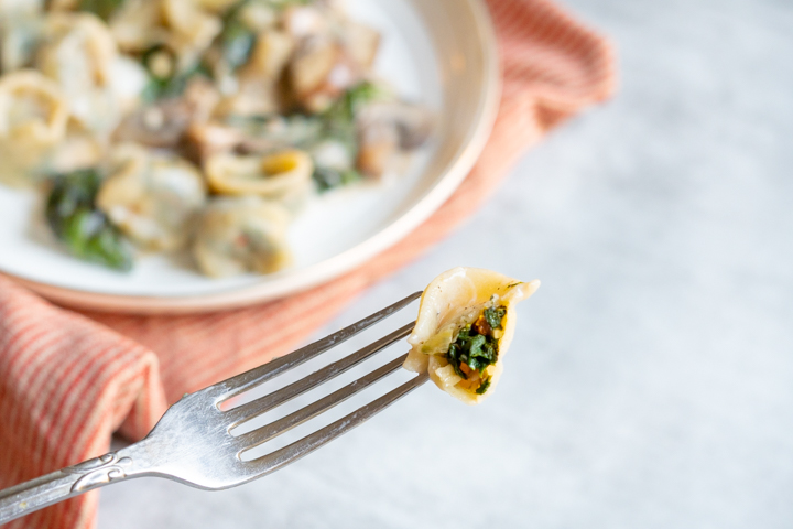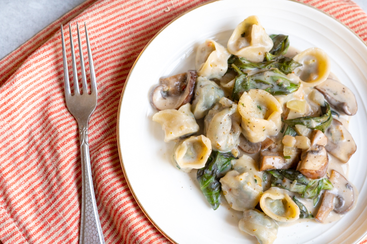 | 9. Breng een pan water voor de pasta aan de kook en kook de tortellini 4 minuten. Giet de pasta af, maar hou een mok kookvocht apart. |