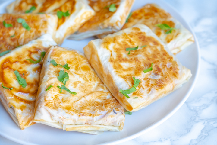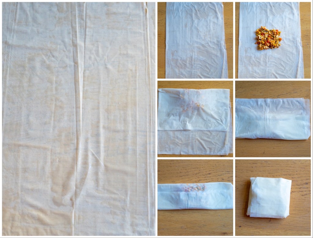 Ik had nog filodeeg over, nadat ik de bastilla had gemaakt. Voor deze pakketjes heb ik daarom weer hetzelfde filodeeg gebruikt. Ik gebruik dus hele grote vellen bij het vouwen. Mocht je kleinere vellen filodeeg hebben, dan kan het zijn dat je het vouwen iets anders aan moet pakken of 2 vellen per pakketje moet gebruiken.