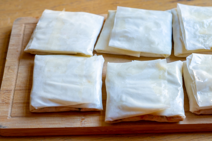 | 9. Verwarm een koekenpan op middelhoog vuur. Leg er een paar pakketjes in en bak deze goudbruin. Draai ze om en bak ook de andere kant goudbruin. Bak zo alle pakketjes goudbruin en krokant. |