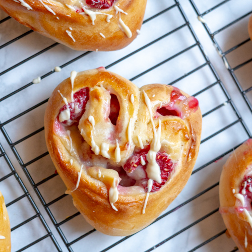 Zachte, zoete koffiebroodjes met een frambozen cheesecake vulling. Niet alleen voor je valentijn geschikt, maar ook heel erg zoet voor moederdag.