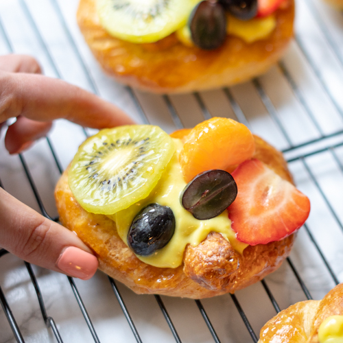 Nog een koffiebroodje, maar dan de echte klassieker. Met een vulling van banketbakkersroom en topping van fruit. Ook erg lekker met alleen aardbeien.