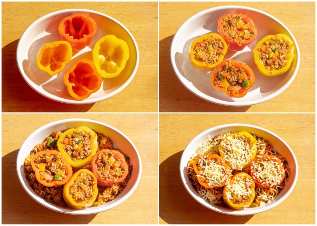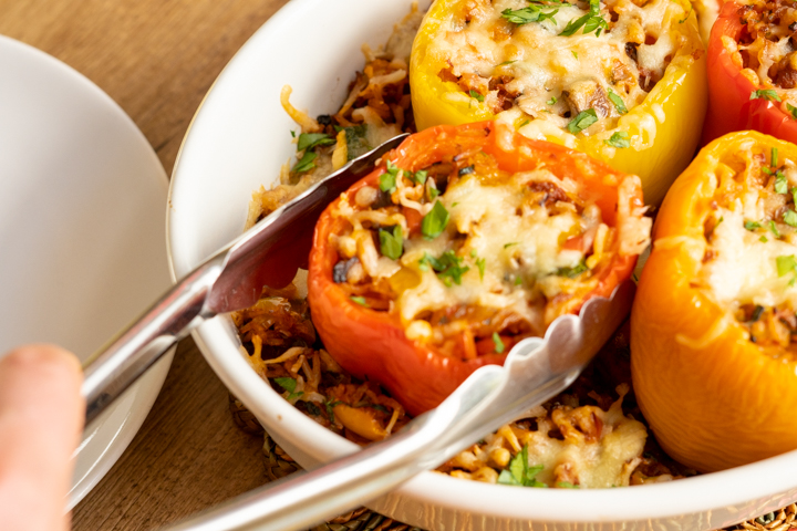 Om de paprika’s te vullen snijd je de kapjes eraf. De kapjes kun je gewoon in kleine blokjes snijden en door de vulling doen. Daarna kook je de paprika’s kort voor. Hierdoor worden de paprika’s lekker zacht.
