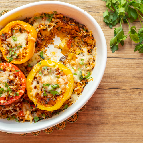| 8. Vul de paprika’s met de rijst. Als er rijst over is doe je dit op de bodem van de ovenschaal, zet vervolgens de paprika’s hierin. Strooi er geraspte kaas overheen. |