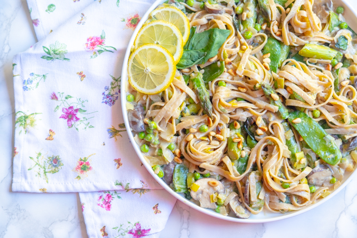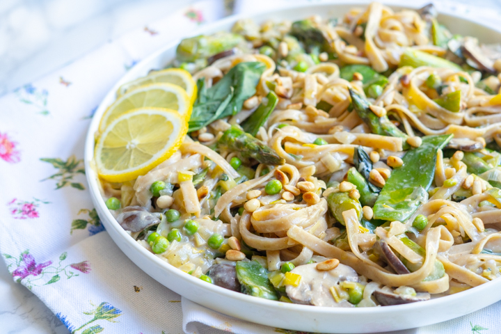 Eigenlijk hebben deze groentes niet veel nodig. Ik doe er een scheutje alpro kookroom light bij en wat citroen. Citroen maakt het geheel wat frisser en haalt de smaken op. Edelgist geeft de pasta een hartige smaak. En als kruiden gebruik ik verder alleen basilicum. Strooi er als laatste wat pijboompitten over voor een lekkere bite en je hebt een heerlijke lentepasta.