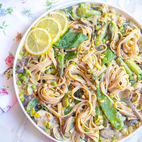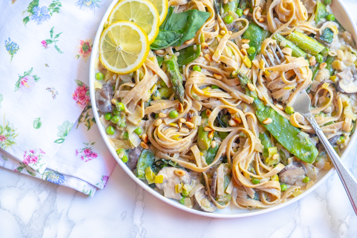 Groene asperges, doperwten, peultjes en prei. Deze pasta zit vol lentegroenten. Daar heeft deze pasta zijn naam dan ook aan te danken. Een heerlijke pasta, met groenten van het seizoen.