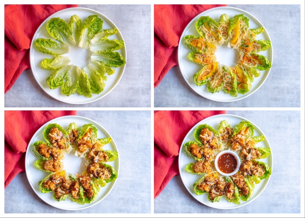 | 9. Haal de blaadjes van de little gem los. Doe in ieder blaadje wat mihoen. Verdeel hier de bloemkool over. Strooi als laatste de sesamzaadjes over de sla pakketjes. Serveer met de resterende saus. Of zet zoals ik alles op tafel, zodat je het aan tafel zelf kunt doen. |