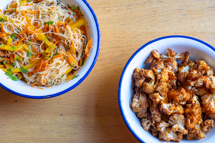 Om de pittige smaak van de bloemkool wat te breken, doe ik er een frisse mihoensalade bij. Maakt het ook een lekkere lichte maaltijd. Er gaat een dressing door van onder andere limoen, gember en sojasaus. Wat wortel en paprika zorgen voor een extra bite en vitamines.