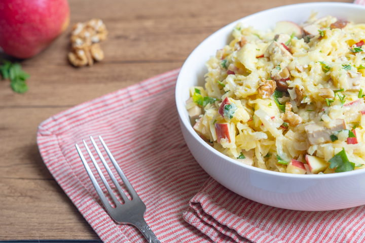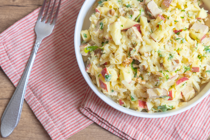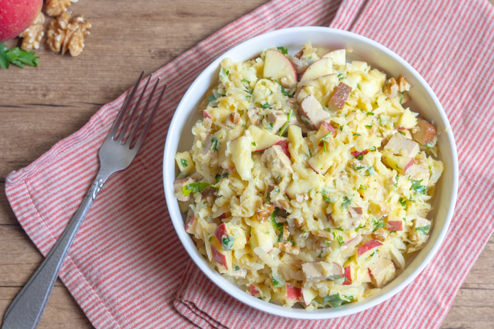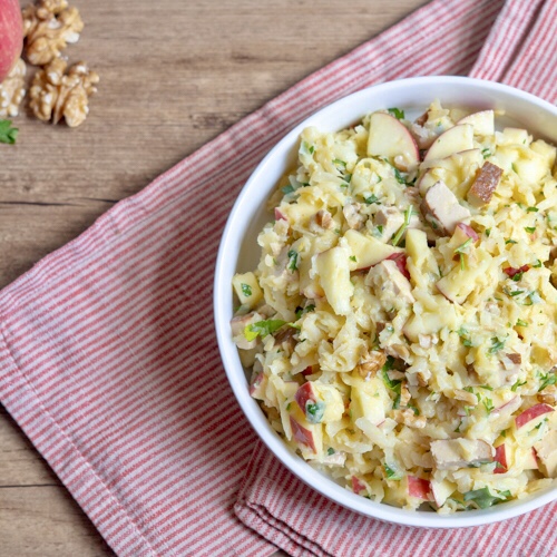 Deze salade is geïnspireerd door een waldorfsalade, maar dan vegan en met knolselderij. Het is een frisse salade, met romige dressing en heerlijke gerookte tofu. Lekker met de krokante bite van walnoten.