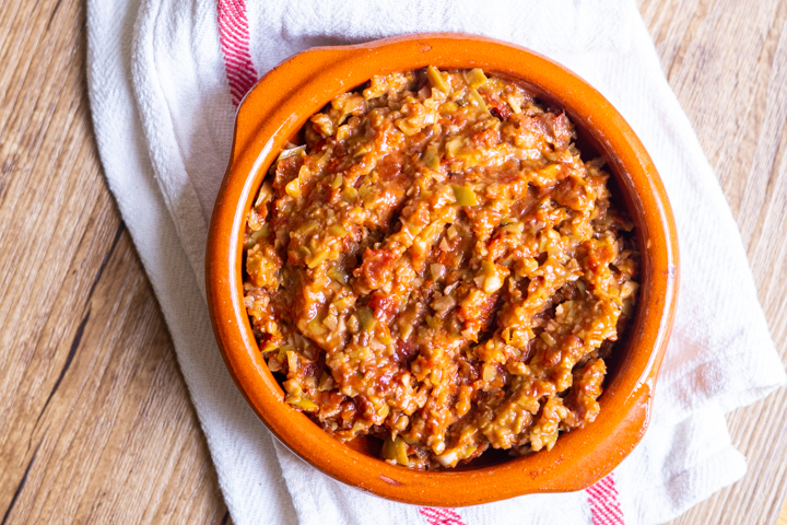 De tapenade maak ik van zongedroogde tomaten. Ik kies altijd tomaten in water. Deze zijn ook erg lekker en een stuk lichter. Verder gaan er olijven door. Je kunt zwarte of groene kiezen, wat je lekker vindt. Ik hou zelf meer van groene. Rodewijnazijn haalt door het zuur, de smaken extra op. Nog een klein teentje knoflook, olie en zout en je tapenade is af. Ik gebruik deze tapenade bijvoorbeeld in een lunchsalade met sperziebonen of op een panini.