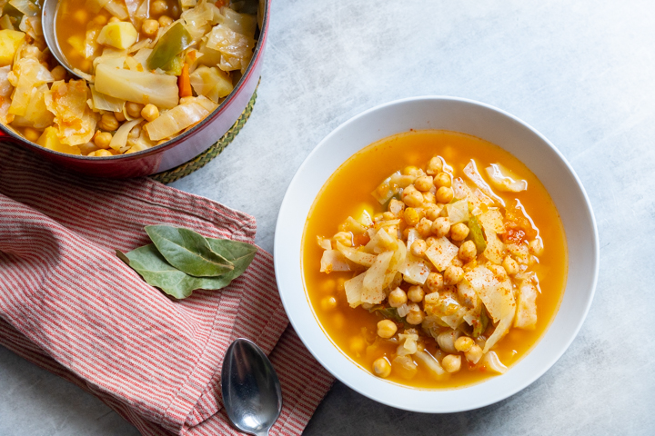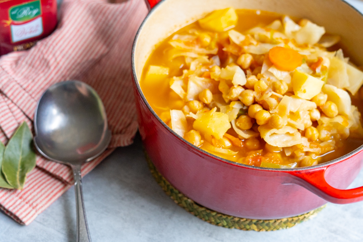 | 3. Verhit wat olie in een zware pan en voeg de ui en paprika toe. Bak totdat de ui glazig is. Voeg dan de kool, kikkererwten, tomaat en wortel toe. Voeg ook de knoflook, laurier, paprikapoeder en het water toe. Breng aan de kook en laat een uur zachtjes doorkoken. Voeg tussendoor eventueel wat extra vocht toe als het te droog wordt. |