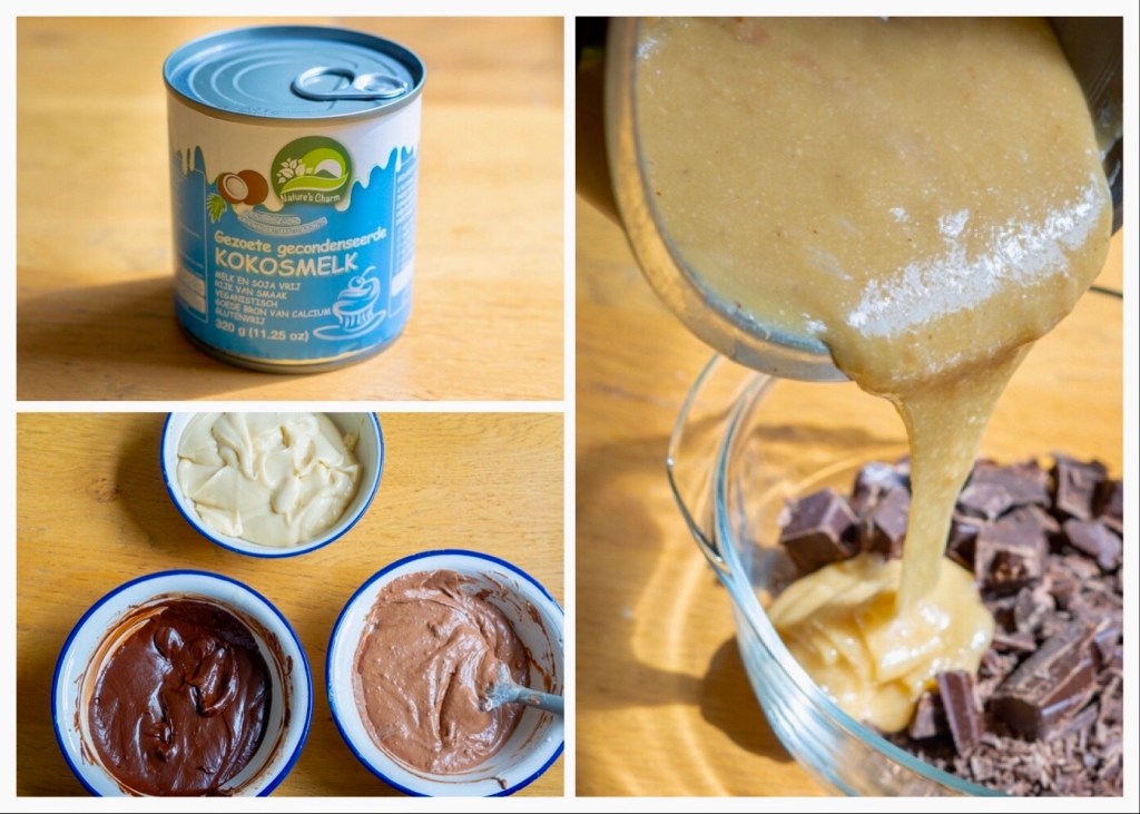 Voor de vanillelaag maak ik een soort vegan banketbakkersroom bij de gecondenseerde kokoksmelk. Deze laag maakt het geheel wat romiger en zorgt ervoor dat het niet een bak vol chocola is (ook lekker, maar nu niet mijn plan). Ik roer een klein beetje geklopte slagroom erdoor, om het iets luchtiger te maken.