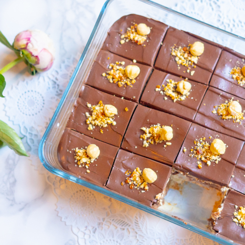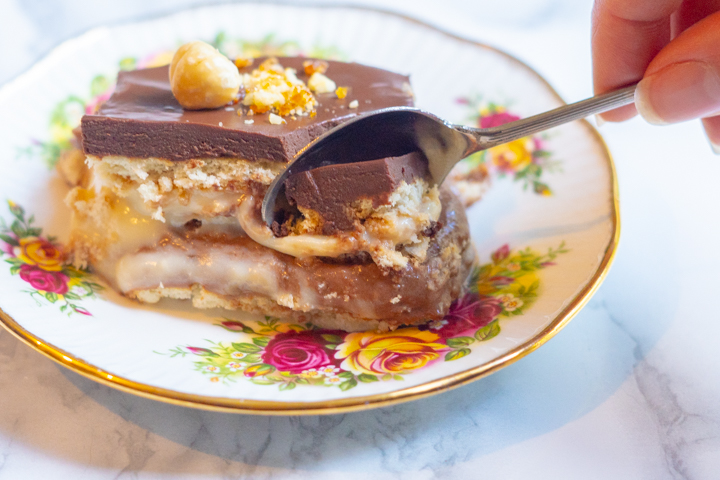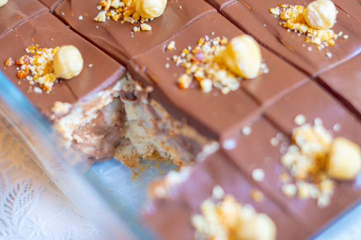 Ik gebruik vaak het woord ‘heerlijk’, maar voor dit nagerecht is ‘weldadig’ passender. Laagjes biscuit worden afgewisseld met romige vanille-, hazelnoot- en chocoladelaagjes. Een soort kinder bueno, in een schaal, die je uit kunt lepelen. Weldadig dus en no-bake én vegan.