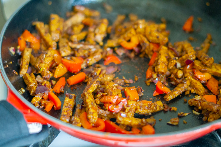 | 5. Verhit wat olie in een koekenpan. Voeg de tempeh, ui en paprika toe en bak een paar minuten, tot de tempeh begint te kleuren. Voeg dan de knoflook, gember, de maggiblokjes, five spice en allspice toe. Roer door en bak een paar minuten. |