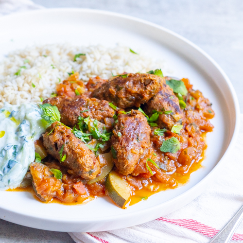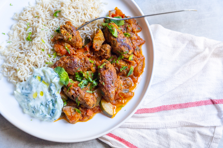 | 9. Verdeel de rijst en de saus met koftes over twee borden. Strooi er eventueel wat extra peterselie over en serveer met de tzatziki. |