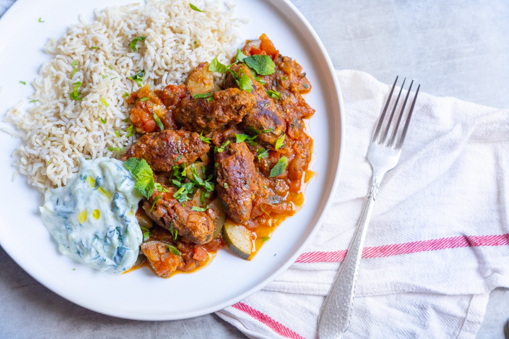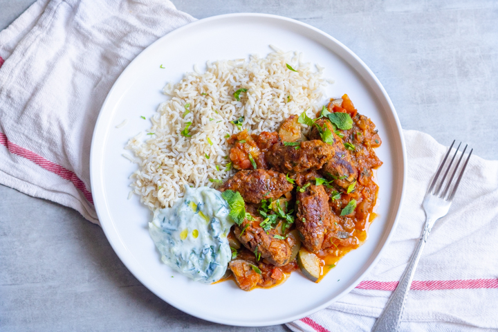 De koftes in tomatensaus serveer ik met rijst. Ik neem nu volkoren rijst, maar als koolhydraatarme optie kun je ook bloemkoolrijst nemen. We zouden het hierbij kunnen laten, maar ik vind een simpele tzatziki toch wel erg lekker erbij. Helemaal als je toch al munt in huis hebt. Voor ik met de saus of het gehakt begin, rasp ik de komkommer vast. Dan heeft het tijd om wat uit te lekken. Dit meng je vervolgens met nog wat knoflook (maakt het uit), munt, citroen en yoghurt. Ik neem ongezoete sojayoghurt. De tzatziki vind ik lekker fris bij de kruidige saus.