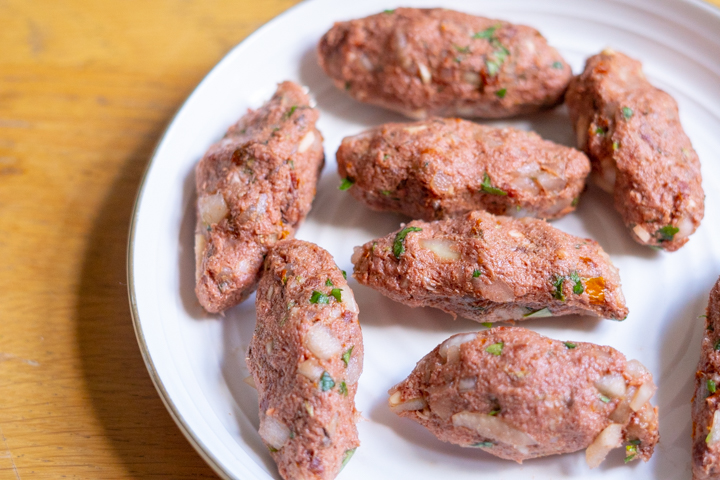 | 3. Snipper de ui en hak de knoflook, olijven, zongedroogde tomaten en peterselie fijn. Doe het gehakt in een kom en voeg de helft van de ui en knoflook toe en alle olijven, zongedroogde tomaten en peterselie. Voeg ook 1 theelepel oregano, de komijn en wat peper en zout toe. Meng door elkaar en knijp er 16 kleine langwerpige koftes van. |