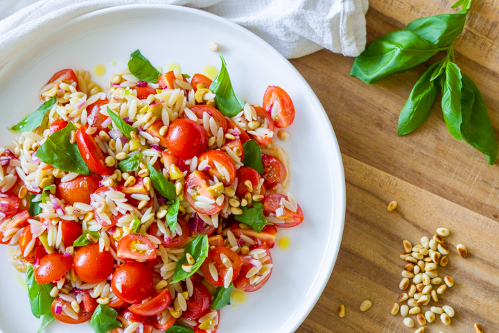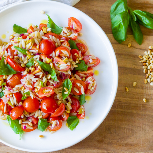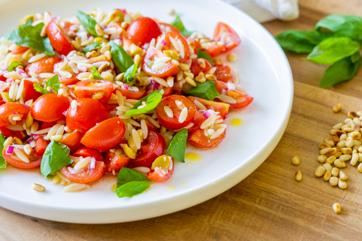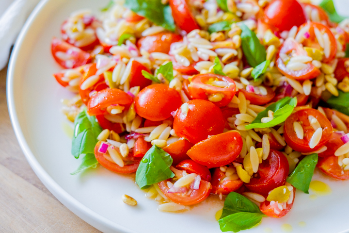 Weer een soort pastasalade. Dit keer vol smaakvolle, zoete tomaatjes. Door de tomaatjes hussel je wat zout en dit laat je even trekken. Hierdoor krijgen ze super veel smaak. Ik doe er nog wat orzo, olijven en basilicum door. Zo heb je een lekkere, gezonde lunch of een fijn bijgerecht.