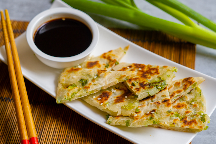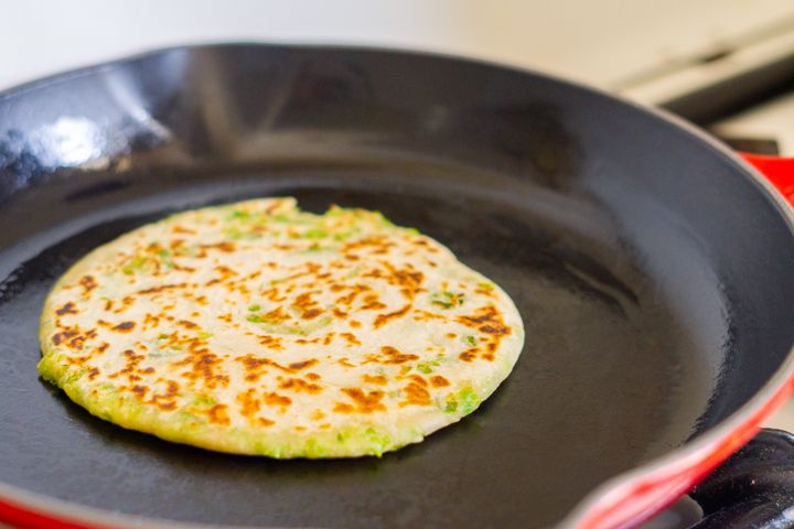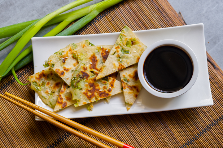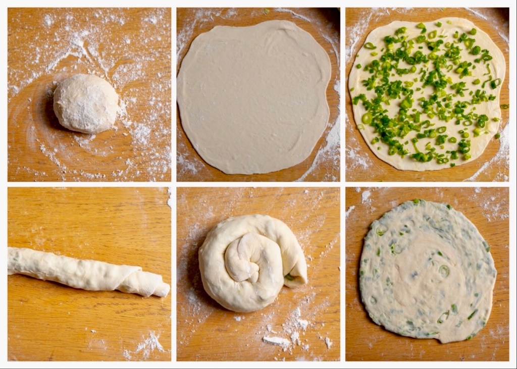 Deze pannenkoekjes zijn een soort van de Aziatische variant van msemmen. Dunne laagjes deeg besmeer je met olie. Dit rol je op en vervolgens rol je het weer uit. Hierdoor komt er een laagje olie tussen de laagjes deeg, waardoor je straks een pannenkoek krijgt met heel veel dunne laagjes. De olie waarmee je het deeg bestrijkt is sesamolie. Dit geeft de Aziatische en notige smaak.
