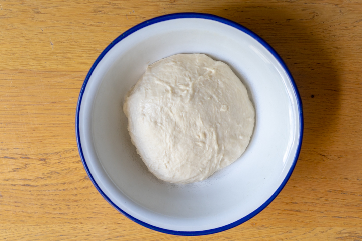 | 3. Maak een bal van het deeg, leg in een kom en dek het af. Laat het 30 minuten rusten. |