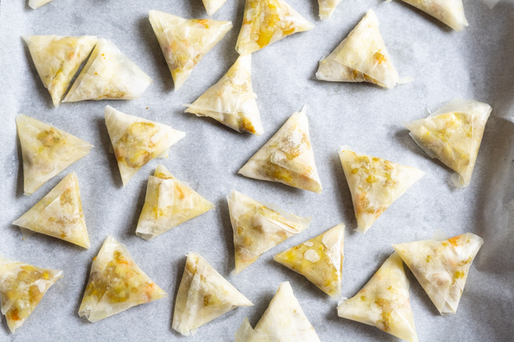 | 7. Neem een strook filodeeg en bestrijk hem met wat olie. Leg een flinke theelepel vulling onderaan de strook filodeeg. Vouw de linker onderhoek over de vulling heen, zodat je een driehoekje krijgt. Vouw zo door totdat de strook helemaal om de vulling gevouwen is en je een driehoekje overhoudt. Leg op de bakplaat en herhaal met de rest. |