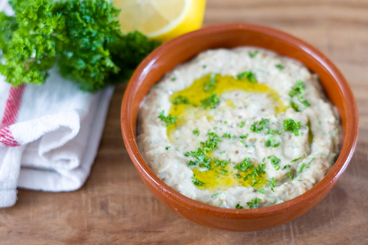 | 6. Hak de peterselie en roer het door de baba ganoush. Proef of het op smaak is en voeg eventueel nog wat zout of de rest van de citroen toe. |