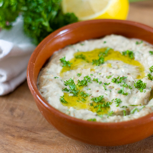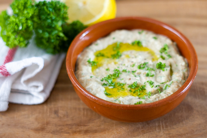 Baba ganoush is een aubergine dip. Heel romig, licht rokerig en erg lekker met pita of platbrood. Aubergines bak je een uur in de oven. Als ze wat zwarte plekjes krijgen, wordt de dip het lekkerst. Dit geeft de rokerige smaak. Daarna klop je het romig met een vork. Echt niet moeilijk, wel heel lekker.