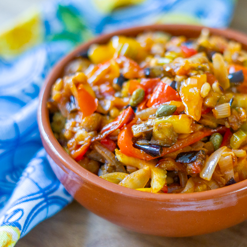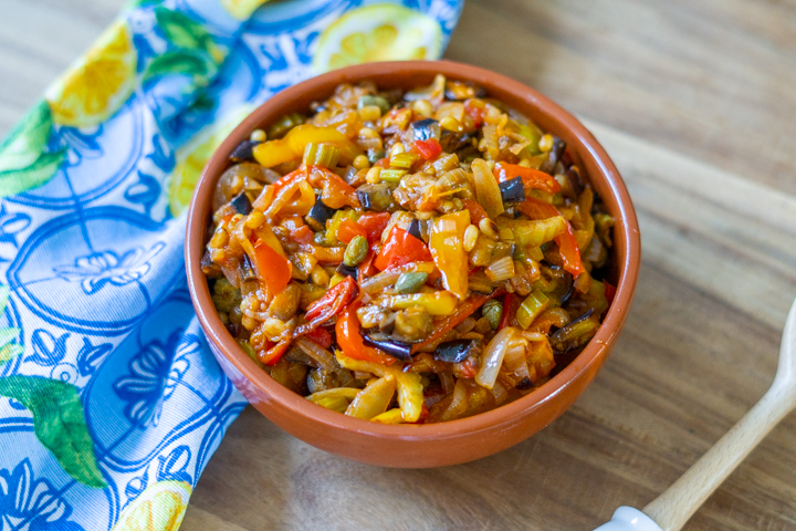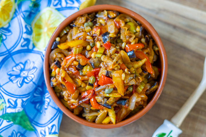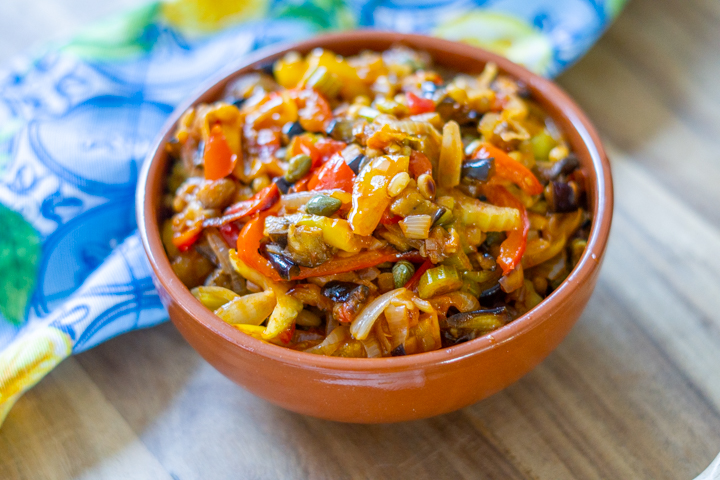 De vriendin van mijn broer is Italiaans. Samen met haar en haar moeder heb ik dit Siciliaanse gerecht gemaakt op Sicilië. Waar kun je het beter leren? Het is een heerlijk groente gerecht, met aubergine, paprika en pijnboompitten. Je kunt het met een broodje als lunch eten of als bijgerecht bij het avondeten.