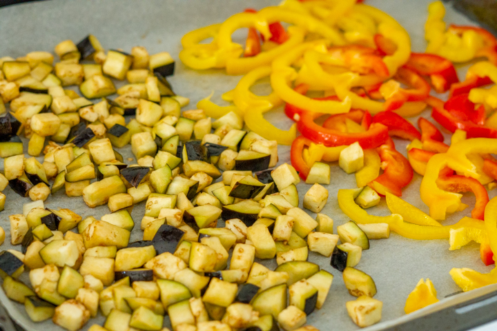 De aubergine snijd je in blokjes en doe je in een vergiet. Vervolgens strooi je er wat zout over. Dit voorkomt dat de aubergine bruin wordt en maak de aubergine iets minder bitter van smaak. Dit laat je even staan. Dan leg je het op een bakplaat, samen met de paprika en bak je het een half uur voor in de oven.