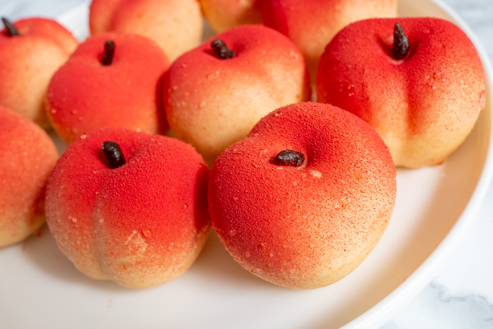 Als je wilt kun je de perziken nog afmaken met wat rode kleurstofspray. Hierdoor lijkt het nog meer op een perzik. Het is een werkje, maar dan heb je wel een speciaal gebakje. Voordeel aan de gebakjes is dat de mousse sowieso de vriezer in moet om goed te kunnen coaten. Dus je kunt het prima een paar dagen van te voren maken.