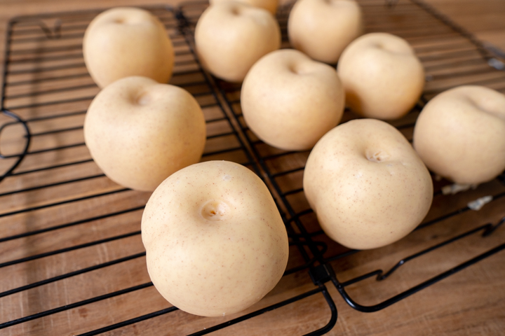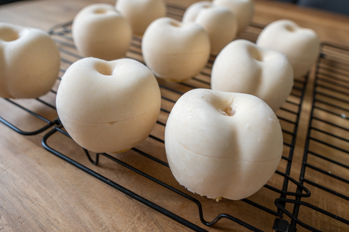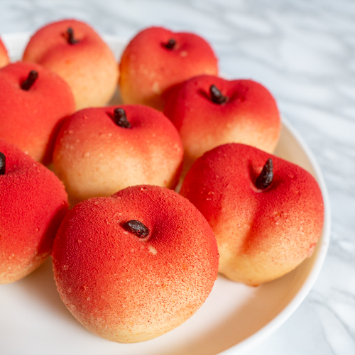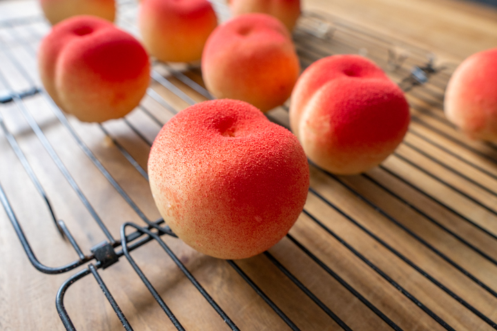 | 21. Afwerking: Spray de bovenkant van de perziken eventueel met wat rode kleurstof. |