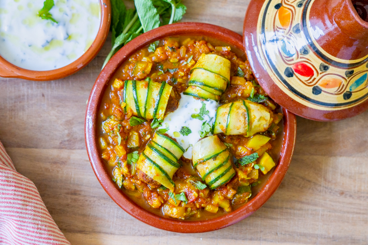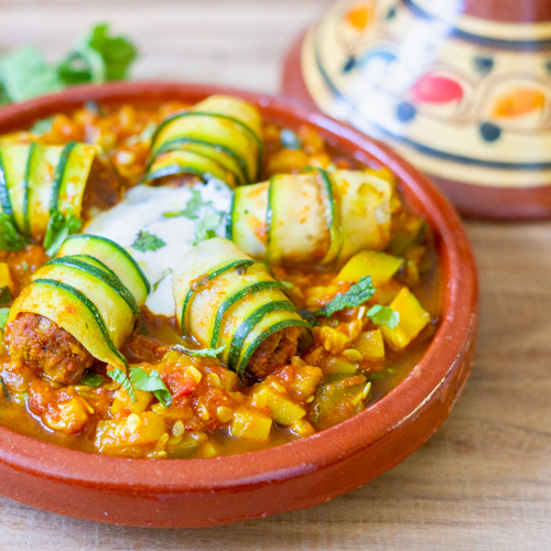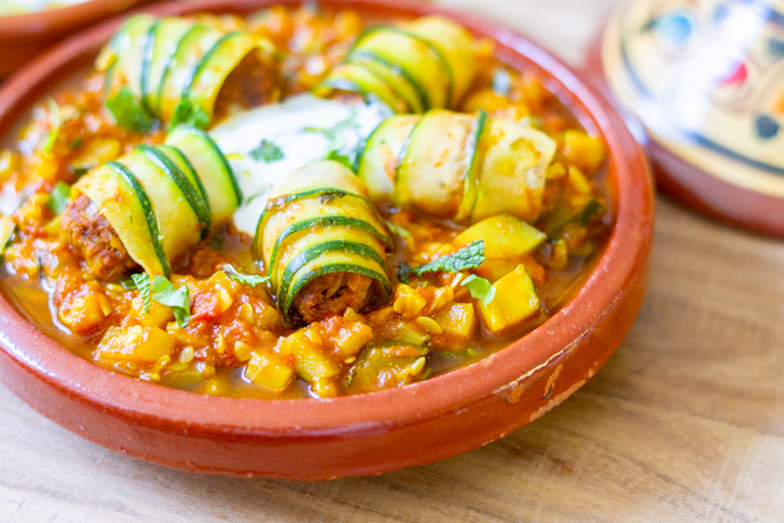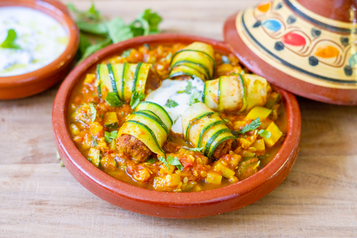 Deze gehaktrolletjes hebben het goed. Gehaktstaafjes wikkel je in courgettelinten en stoof je in een kruidige saus. De courgette wordt hierdoor lekker zacht, wat goed samen gaat bij de bite van het gehakt. De saus breng je op smaak met paprikapoeder, koriander, komijn en kaneel. Lekker met de frisse muntyoghurt.