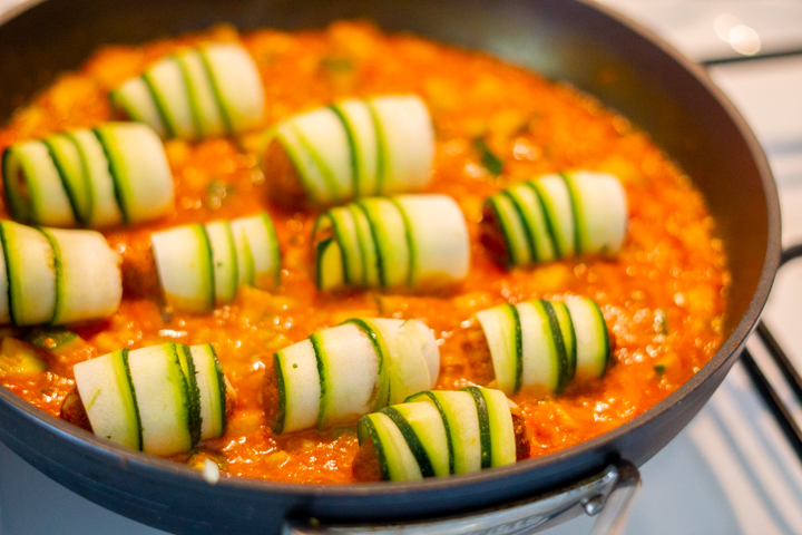 De saus is heel simpel. Ui fruit je aan, waarna je knoflook en de rest van de kruiden toevoegt. Dit bak je even mee, waarna je tomaten toevoegt. Je kunt de tomaten in blokjes snijden of even malen in een keukenmachine. Dit roer je door elkaar, waarna je de courgetterolletjes erop legt. Dit laat je 10 minuten stoven met de deksel op de pan en dan 10 minuten zonder.