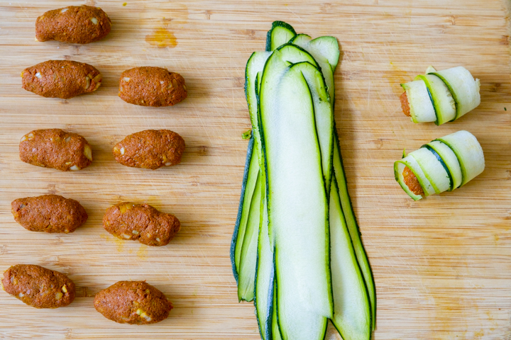 | 3. Maak met een dunschiller 10 linten van de courgette. Snijd de linten door de helft. Neem een courgettelint en leg hier ongeveer een millimeter naar links een andere lint op. Neem een gehaktrolletje en wikkel hem in de courgette. Herhaal met alle gehakt. |
