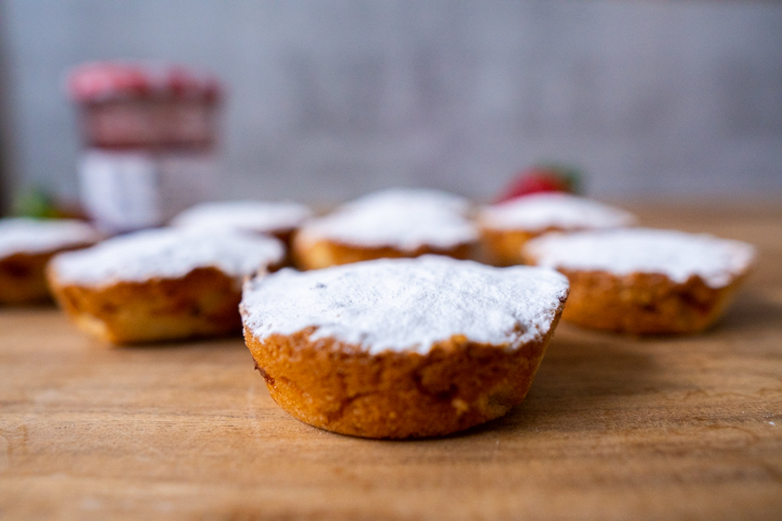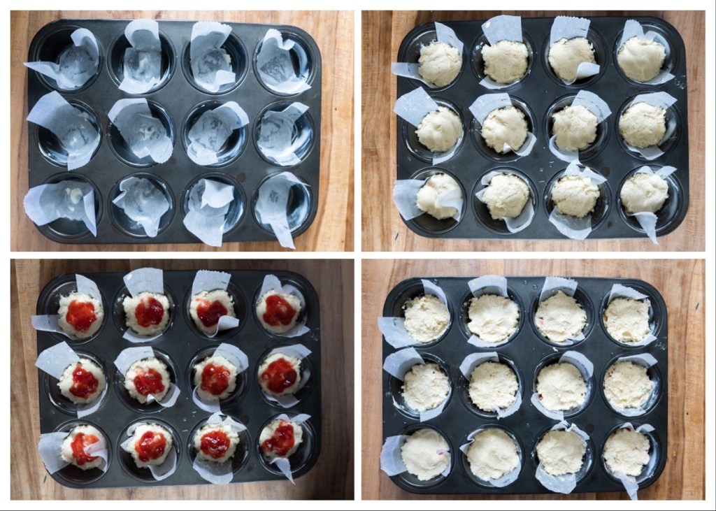 | 5. Verdeel de helft van het beslag over de bodem van de muffinvormpjes. Verdeel hier de jam over en vervolgens de rest van het beslag. |
