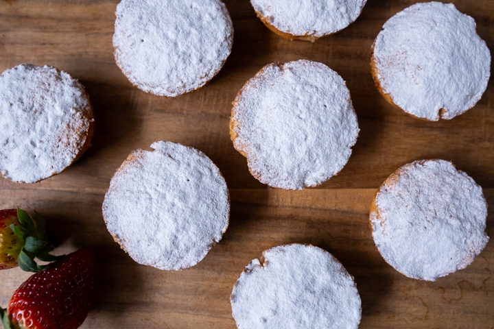 Bij mij plakten de koeken heel erg aan de muffinvorm. Ook als ik de vorm goed beboterde en er nog wat bloem in deed. Daarom heb ik stroken bakpapier geknipt en die in de holtes gelegd. Als je een vorm hebt met betere antiaanbak, dan kan het zijn dat dit niet nodig is. De koeken kun je het makkelijkst met een spuitzak in de vorm spuiten, maar ik heb het nu met lepels geprobeerd en dat gaat ook prima.