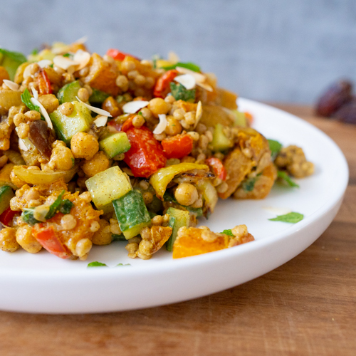 Een salade als lunch doe je misschien eerder in de zomer. Toch is deze salade ook erg lekker met dit koude weer. Pompoen rooster je in de oven met paprika en ui. Daar gaat ras el hanout bij, wat een warme smaak geeft. Met parelcouscous, dadels en en een dressing van tahin heb je een salade die ook goed smaakt als het buiten weer eens regent.