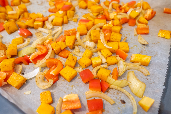 | 3. Doe de pompoen, paprika en ui op de bakplaat. Strooi de ras el hanout en wat zout erover. Doe er ook wat olie bij en hussel het door elkaar. |