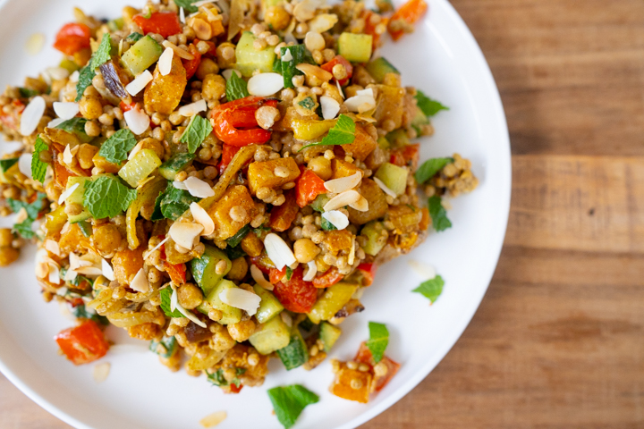 Parelcouscous vind ik door de stevige bite erg lekker. Ik neem altijd een volkoren variant, waardoor het ook een gezonde optie is. Deze couscous is helemaal niet ingewikkeld te bereiden. Je kunt hem gewoon koken. De kooktijd kan verschillen, dus kijk daarvoor altijd even op de verpakking. Met de parelcouscous wil ik wat Arabische smaken combineren.