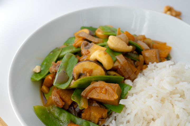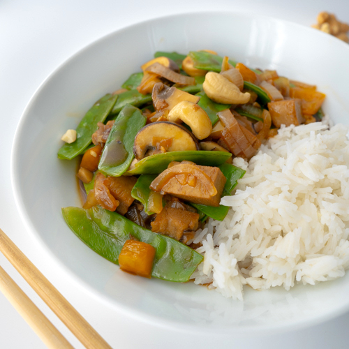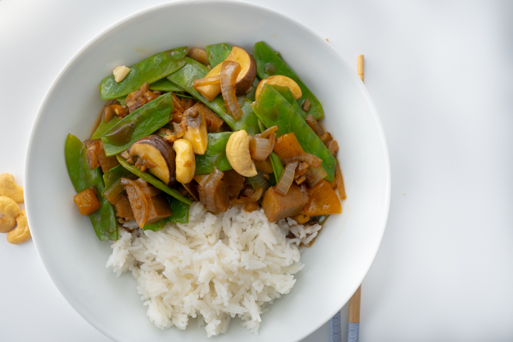 | 8. Voeg de cashewnoten toe aan de saus en roer door. Serveer met de rijst. |