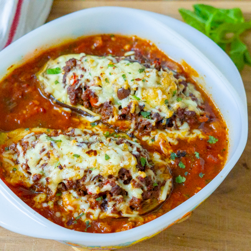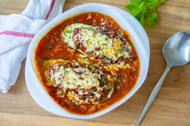 Deze aubergines worden super lekker zacht in de tomatensaus. Ze zijn gevuld met vegagehakt, wat juist voor een stevige bite zorgt. De tomatensaus heeft een warme smaak door Italiaanse kruiden, paprikapoeder en kaneel. Heerlijk bij de aubergine.