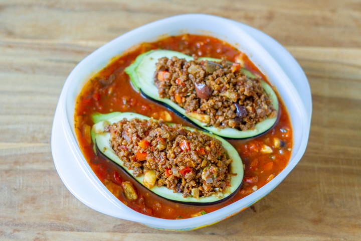 | 6. Giet de tomatensaus in een ovenschaal. Vul de aubergines met het gehakt en leg ze in de tomatensaus. Dek de schaal af met aluminiumfolie. |